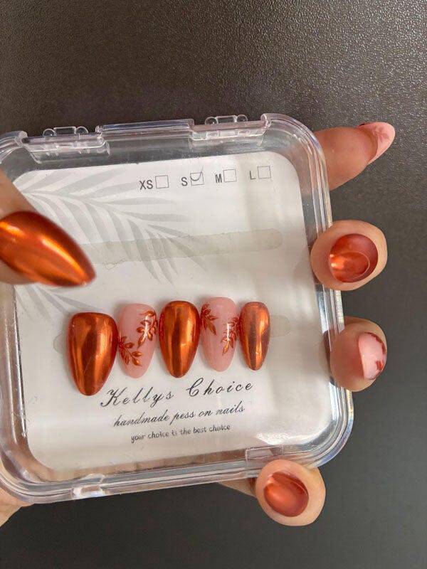 Elevate your retro-luxury style with our Press-Ons! Featuring copper metallic mirror bases and nude pink bases with hand-painted golden leaf motifs — these nails blend vintage elegance with modern metallic glamour. The high-shine copper finish and delicate leaf details create a sophisticated look, perfect for daily ensembles, autumn gatherings, or adding a couture-inspired, nature-meets-opulence touch to any outfit.