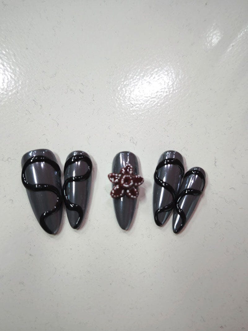 Moody gunmetal-gray bases with sleek black swirl accents & red beaded star embellishments creates an edgy, atmospheric bold look. A high-shine glossy finish balances smooth depth and sharp, textured detail contrasts. The slender stiletto shape offers a dramatic, elongated silhouette. This dark-whimsical style blends gothic edge with subtle ornate charm. It fits alternative-themed events and moody urban outings—striking, distinctive, and effortlessly evocative.