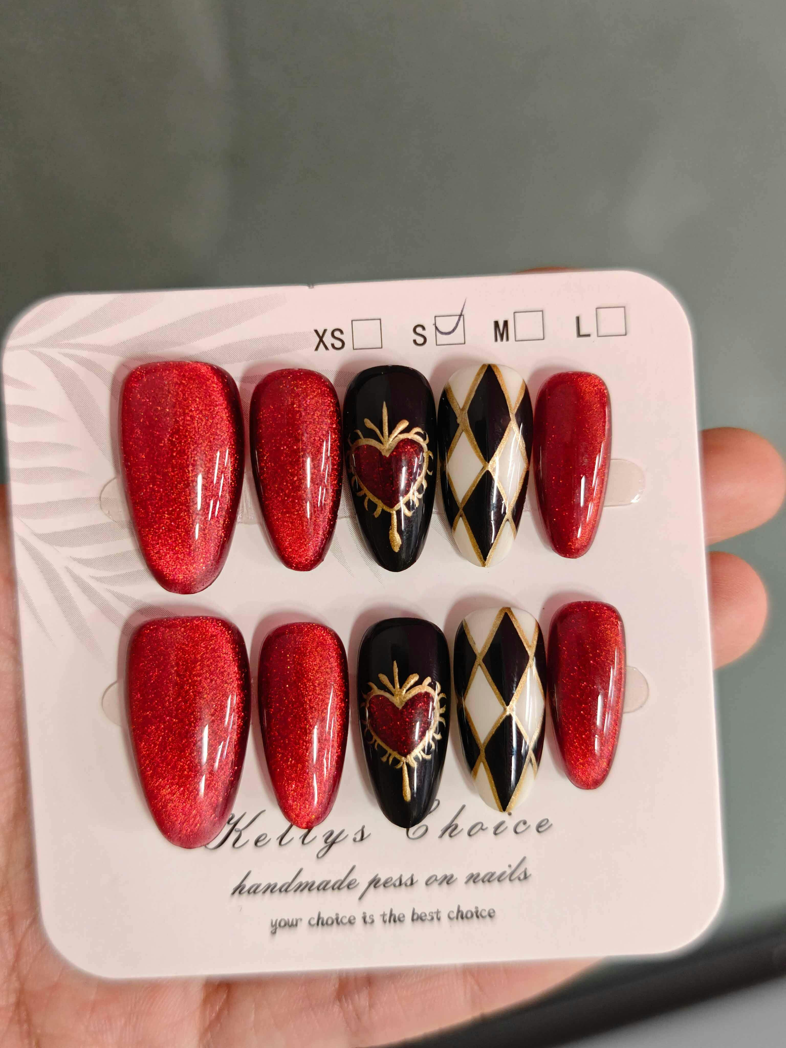 Elevate your retro-chic luxury style with our Press-Ons!Featuring shimmering wine-red bases, black panels with golden heart details, and black-white argyle patterns trimmed in gold — these nails blend sweet retro charm with understated opulence.The glittering wine-red palette and distinctive details create a bold yet elegant look, perfect for weekend gatherings, themed parties, daily edgy-chic outfits, or adding a retro-luxurious, polished touch to any personalized ensemble.