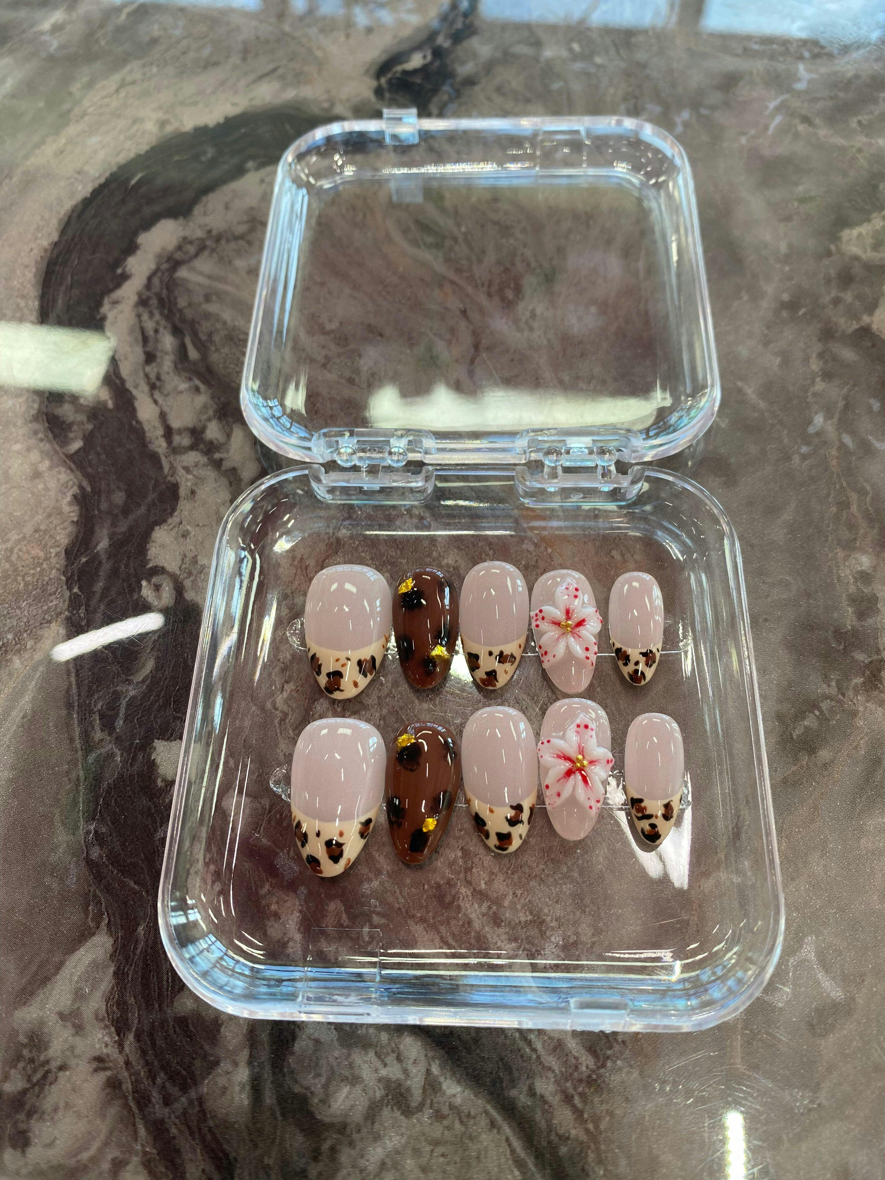 Elevate your sweet-yet-wild style with these Press-On Nails! Featuring nude pink bases, French tips, brown leopard prints, deep brown nails with tiny gold accents, and 3D pink floral charms — all in sleek almond shapes. Perfect for daily wear, dates, or adding a charming mix of sweetness and wild flair to any look.